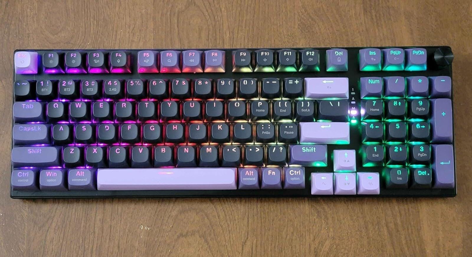 Mechanical keyboard with purple keycaps and RGB lighting on a black background